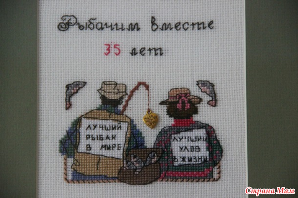 Небольшой дизайн "Лучший улов в жизни" или "лучший рыбак в мире", сама работа 40 на 60 крестиков, вышилась довольно быстро в совместнике "Свадебный переполох" https://www.stranamam.ru/post/6524887/. Вышивала подбором, из того что было). Это подарок родителям на юбилей свадьбы