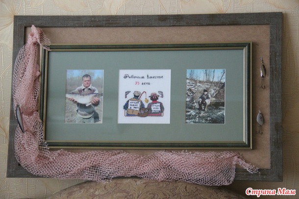 Небольшой дизайн "Лучший улов в жизни" или "лучший рыбак в мире", сама работа 40 на 60 крестиков, вышилась довольно быстро в совместнике "Свадебный переполох" https://www.stranamam.ru/post/6524887/. Вышивала подбором, из того что было). Это подарок родителям на юбилей свадьбы
