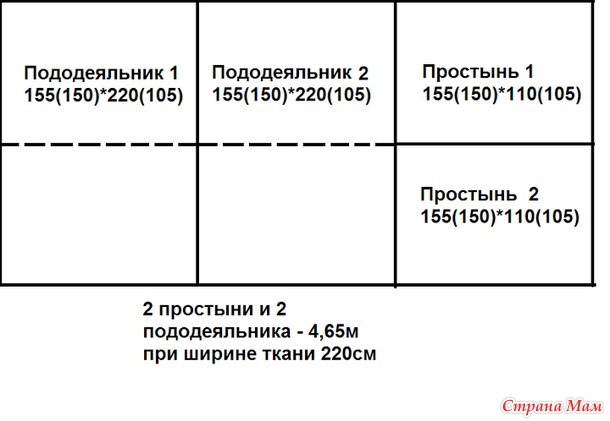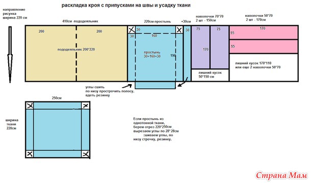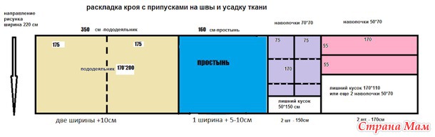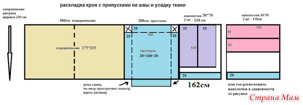 9. ширина 220, двуспальный, с припусками на швы, 2 наволочки 50х70, простынь 160х200 на резинке, общий расход 7,3 м