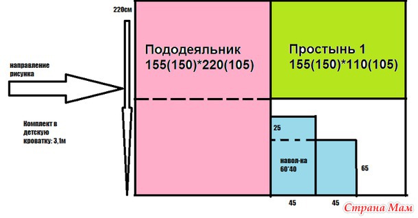 8.1 простынь на резинке 90х180, 1 наволочка 50х70, 1 пододеяльник 150х200, общий расход 5,6 м
