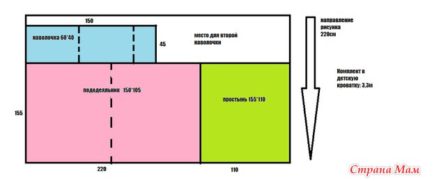 10. ширина 220, поперек рисунка, полуторный, 2 наволочки 50х70, общий расход 5,7 м