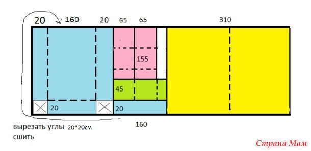 12. бортики в кроватку 60х120, расход 190 см при ширине 220, высота 220, желтые - длинные борта, зеленые - короткие борта, остаток - на завязки