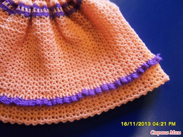 В остальных рядах никаких прибавлений больше не делаем! Шестой ряд - поменяла нить на голубую . Седьмой ряд - опять оранжевая (ССН,1ВП,ССН,1ВП....).Восьмой ряд - голубая нить. Все - кокетка связана. Теперь точно также вязала спинку кокетки ( опять набираем 45 возд. петель и т.д.). Но вообще-то можно было вязать вкруговую сразу и перед испинку,тк. вырез горловины получился не маленький - головка ребенка хорошо входит. Но я вязала по описанию - отдельно перед и спинку. Теперь начинаем вязать юбочку. Сразу после рюши соединять две половинки нельзя - будет узко в груди, плохо одевается, провяжите несколько рядов отдельно перед и спинку, а потом соедените и вчяжите вкруговую. Юбочка вяжется не так, как у автора. Вяжите юбочку по схеме