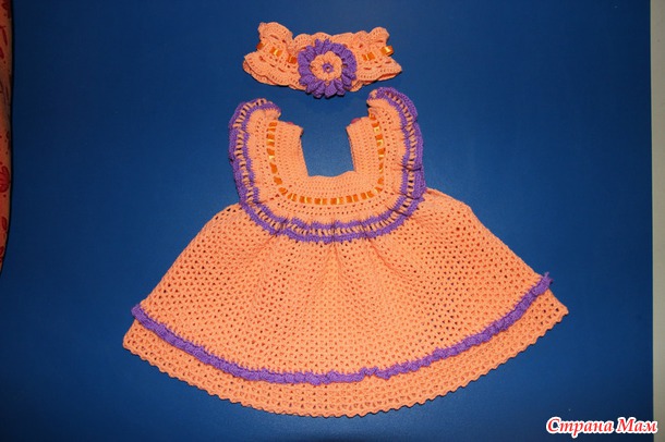 Для маленькой внучки (з мес) связала ей первый сарафанчик и повязочку на голову.