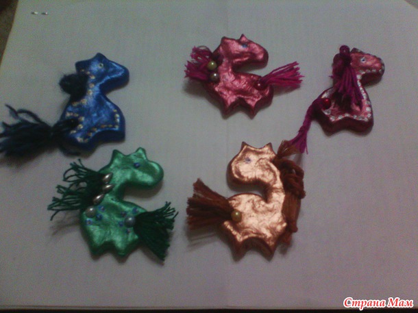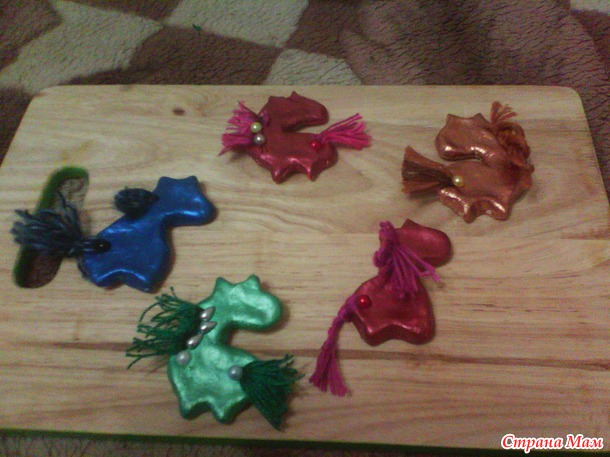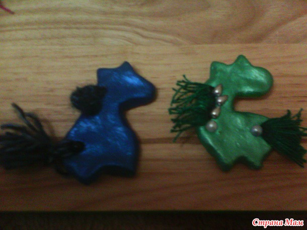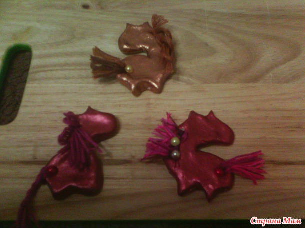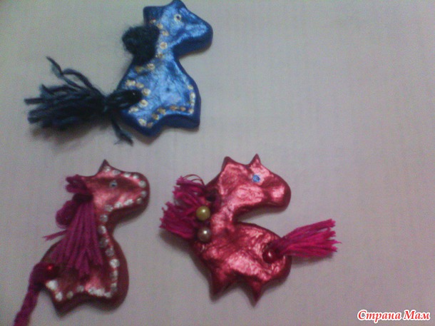 после того как все у нас высохло. начинаем украшать свои игрушки, я сразу решила что у меня будут магнитики и бусы, но с бусами то не вышло, сын решил их себе заиграть для перевозки, так что остались лошадки. приклеила гриву и хвост, добавила бусин, раскрасила и только осталось приклеить магнитик и вуаля, подарочки готовы