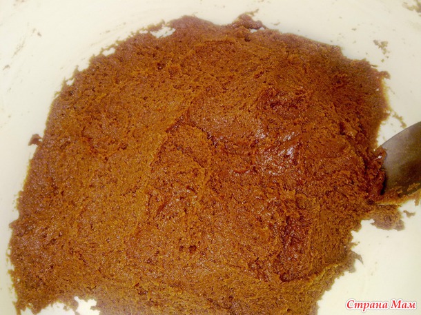 - Следующий этап, постепенно добавляем муку и кокао - порошок, вымешиваем ложкой. Получается густая плотная масса, наподобии пластилина.