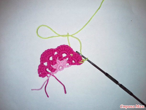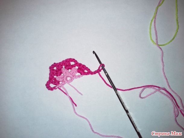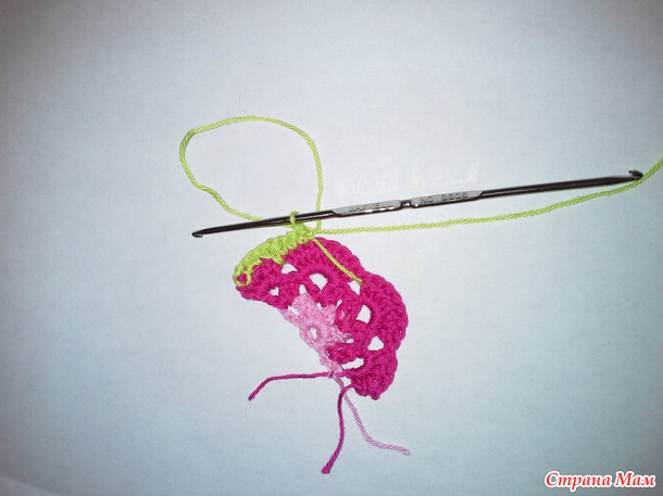 2 ряд. Ввязываем нить другого цвета. Вяжем 5 вп.