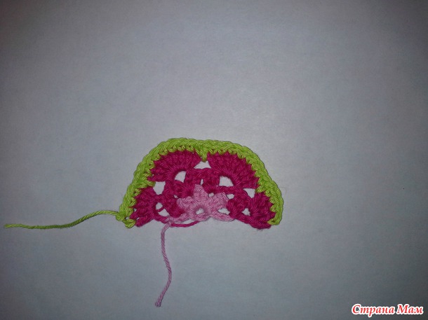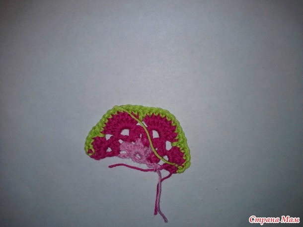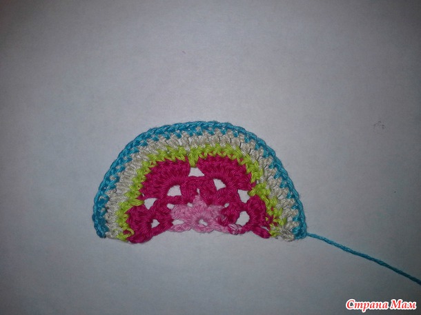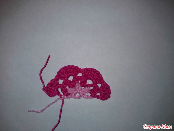 Далее вяжем: 2 ссн в первую арку, (2 ссн, 1 вп, 2 ссн) - во вторую арку и третью арку, (2 ссн, 2 вп) - в четвертую арку, заканчиваем ряд столбиком с накидом.
