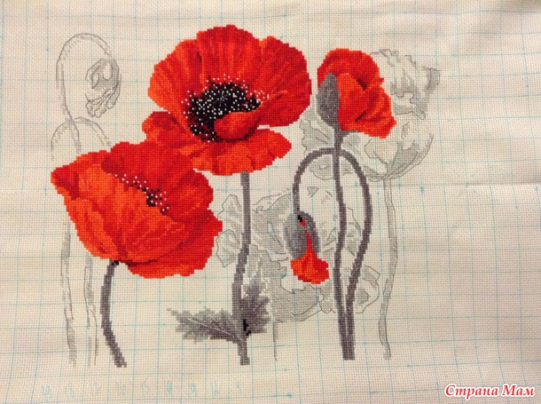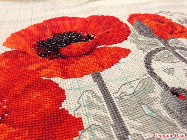 В реальности работа получается очень объемная за счет того, что маки вышиваются в три нитки, маки смотрятся как бархатные.