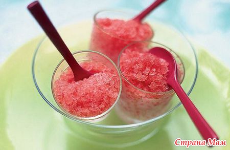 Когда масса загустеет, поскребите вилкой, разрушая ледяной слой. Эту операцию надо повторять до тех пор, пока миска не заполнится ледяной крошкой. Осталось только разложить ее по стаканчикам и подать к столу.