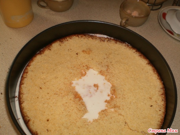 Кладем одну половину коржа в форму в которой его выпекали и заливаем суфле. Суфле нужно оставить половину на заливку второй половины коржа.