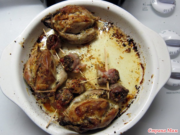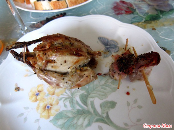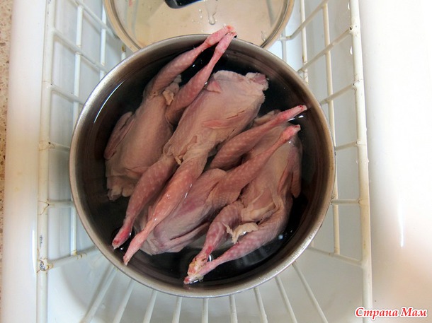Они с вечера были замочены в холодной воде. Утром я их положила в холодное молоко, отварила в молоке до готовности, это буквально 10 минут как закипело молоко и выключила остывать в молоке. За полчаса до того как садиться за стол, нагреваем духовку до 350 градусов Фаренгейта, глиняную посуду смазываю оливковым маслом. Вынимаю рябчиков из молока, кладу в тушки маленькие кусочки соленого сала (чтобы рябчики не были сухими), привязываю ножки к тушках, иначе они сгорят в духовке, потому что слишком тонкие, обмазываю майонезом, каплю посыпаю специями и ставлю в духовку.