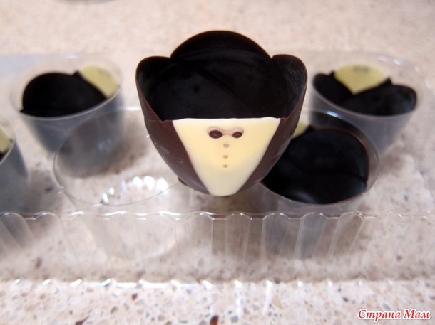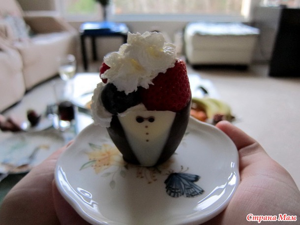 А на десерт: В готовые шоколадные чашечки, положила фрукты со взбитыми сливками