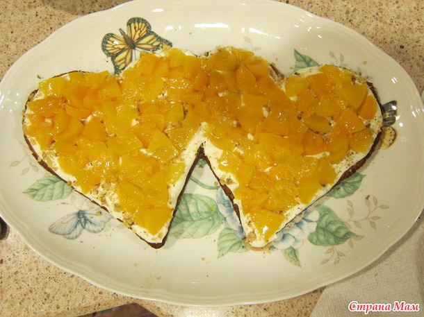 Собираем слои торта: корж, пропитка, крем, орехи, персики, корж, пропитка, крем, орехи, персики и т. д... верхним должен быть сухой бисквит обязательно!