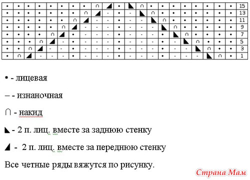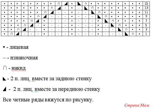 1-й ряд: провяжите 1 лиц. п., накид, провяжите 2 лиц. п. вместе за заднюю стенку, 3 изн. п., 1 лиц. п., 3 изн. п., 1 лиц. п., 3 изн. п., 1 лиц. п., 3 изн. п., провяжите 2 лиц. п. вместе за переднюю стенку, накид, 1 лиц, повторите *-*.
