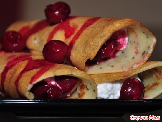 Когда блинчики остынут, начинить их взбитыми сливками и кислой вишней.