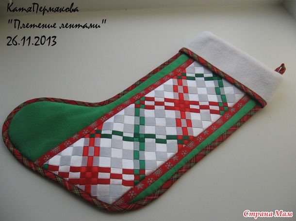 Ну так вот, поспособствовал воплощению совместный проект "Плетение лентами"- https://www.stranamam.ru/post/6440145/, в рамках которого у меня сшился сапожок для подарков с вставкой из ленточной плетеночки. Схему выбрала как подтверждение своих слов, что даже простейшее плетение в двух направлениях может быть весьма эффектным. Использовала атласные ленты шириной 1 см и 6 мм:
