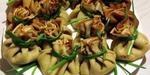 Сложить мешочки на тарелку, украсить пёрышками зелёного лука. И пригласить всех к столу, пока блины в мешочках не остыли.