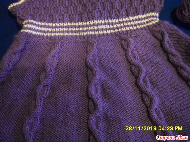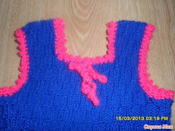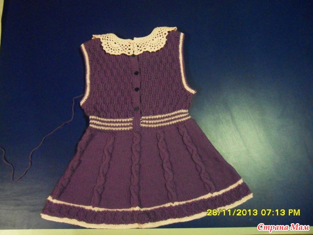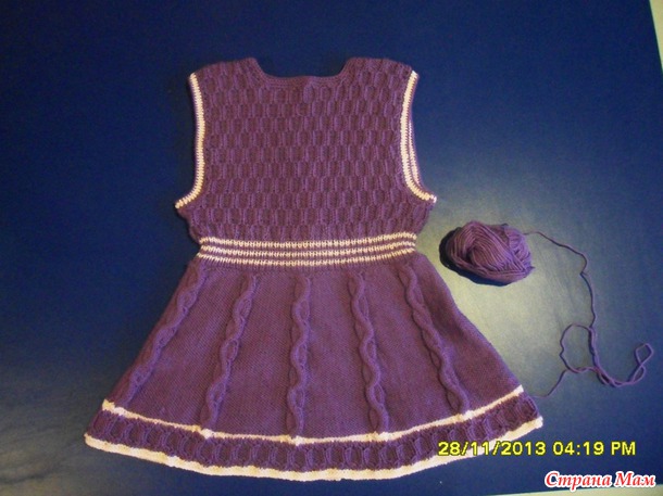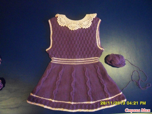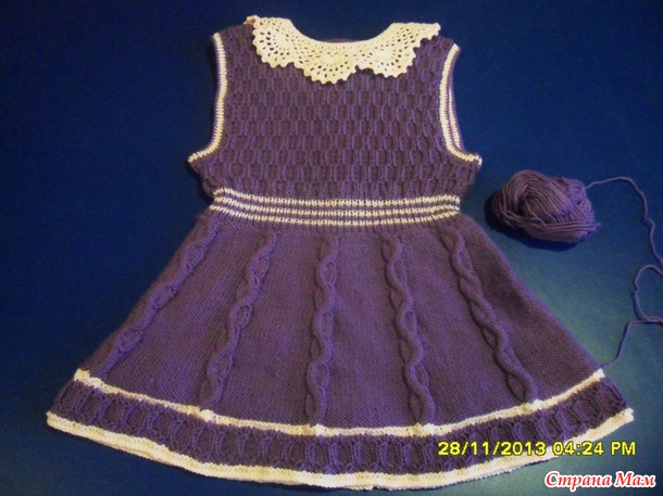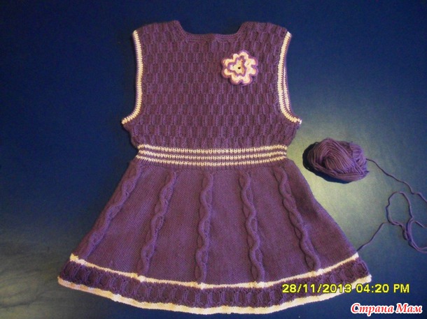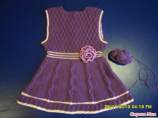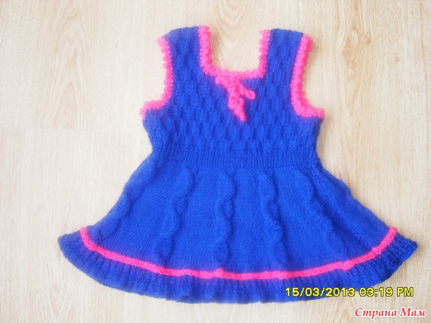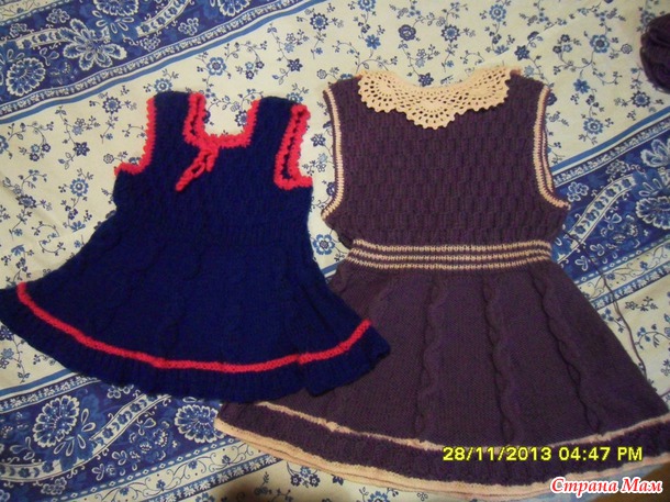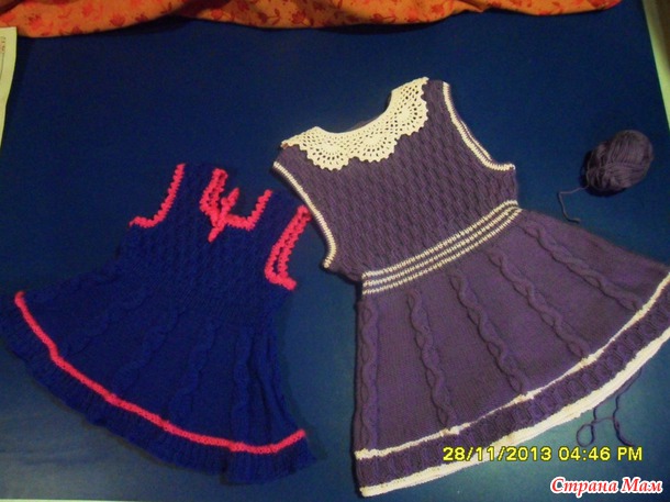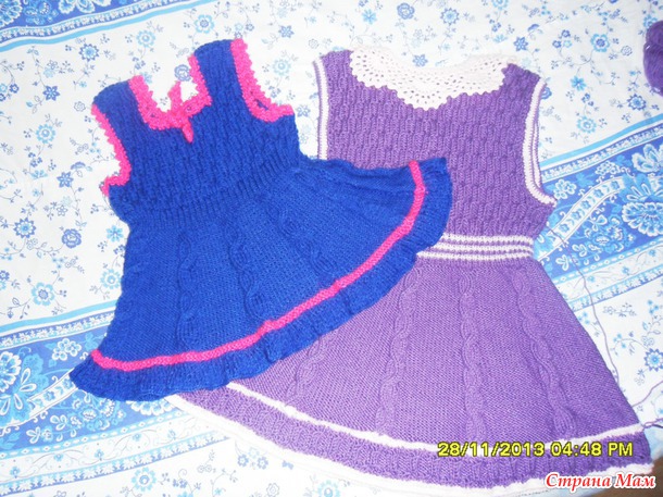 Для двух внучек связала сарафанчики. За образец взяла сарафанчики тут http://moreknitsinrussian.blogspot.ru/2009/09/blog-post.html. Спасибо автору, все очень подробно написано. Пряжа - пехорка "Детская новинка", спицы № 2 и№3. Маленький сарафанчик (на 1-2 года) связала раньше, вязала отдельно перед и спинку.https://www.stranamam.ru/post/5194985/. А старшей внучке ( на 4,5 года) связала сейчас из той же пряжи, кокетку целиком вязала на двух спицах (сзади застежка до талии), а юбочку - на круговых спицах, ушло где-то 130 гр. Обвязываю всегда крючком. На большом сарафанчике вырез горловины специально сделала повыше и не обвязывала контрастным цветом, т. к. предполагается носить с воротничком. Хотя можно и с цветочками. Вот такие варианты :