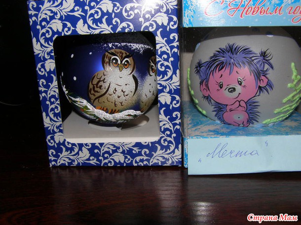 этап шестой- мечта Верочка исполнила мою давнюю хотелочку - стеклянные шарики на елку, а один оказался еще и с моими любимыми совушками