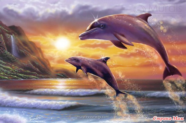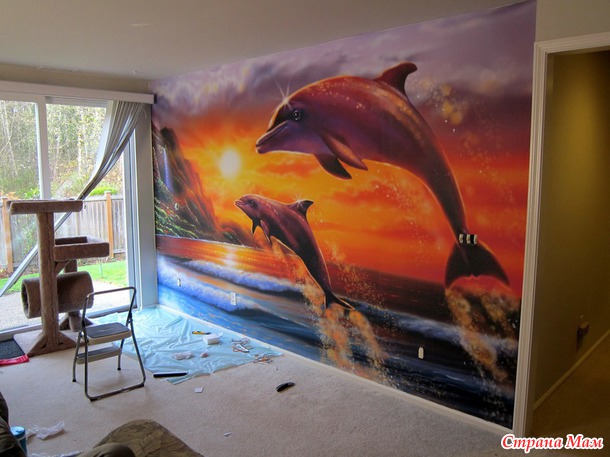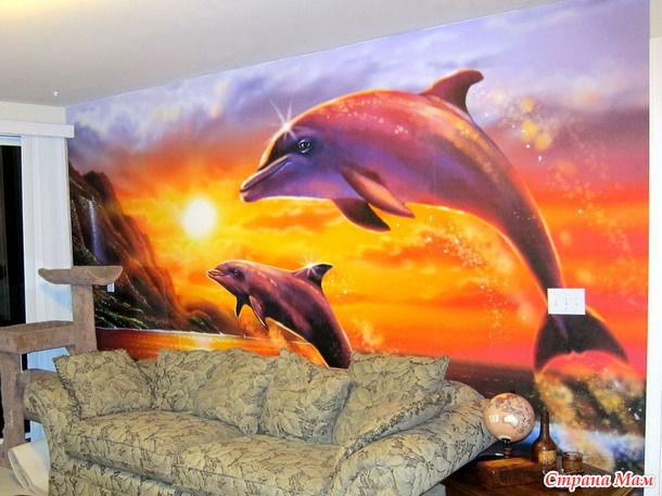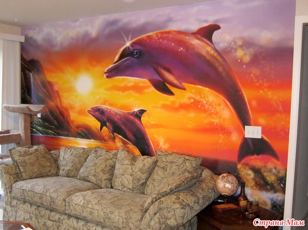 Дельфины это именно то, что было нужно в ту гостиную, с низкими потолками и достаточно темную, они туда внесли солнышко и жизнь! Дочь теперь наконец то перестала сидеть только в своей комнате, а еще стала много времени проводить на диване в той ее гостиной и это уже полностью окупает эти обои