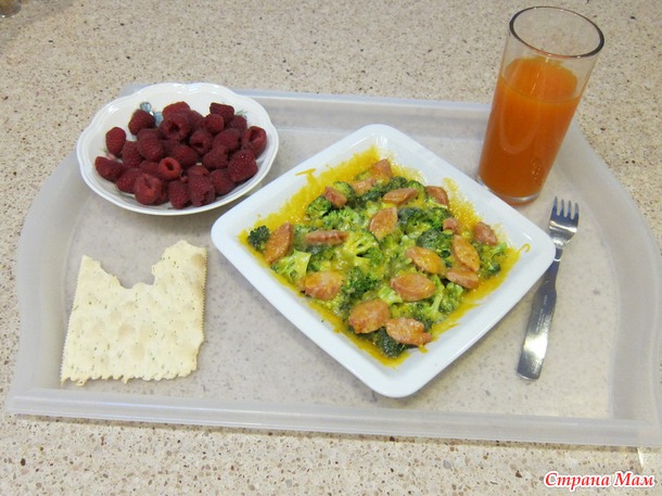 Потом мы быстро пообедали: Сырая брокколи, сарделька, сыр на 3 минуты в микроволновку