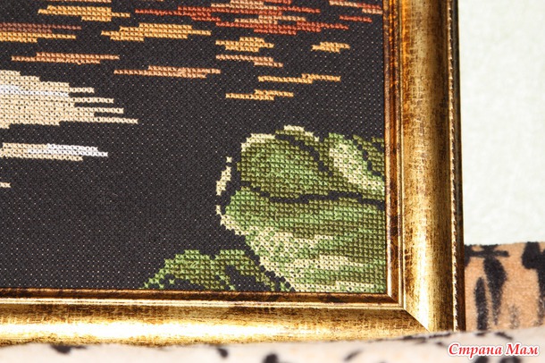 Раму заказывала в багетке, так как размер вышивки не стандартный. Правда без стекла, на время заказа с финансами было туго.