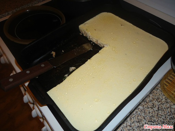общий вид(уже отрезали-конечно. Заливала в лоток, в котором обычно пеку коржи