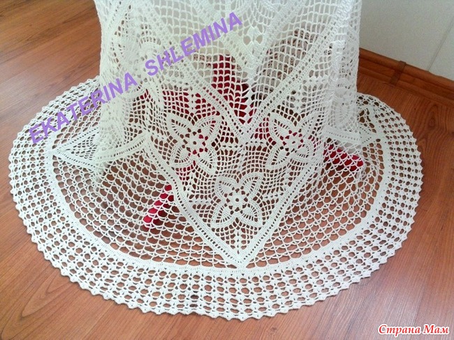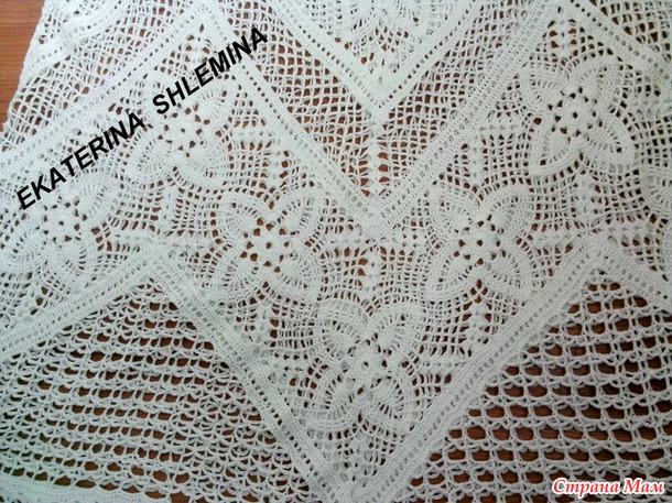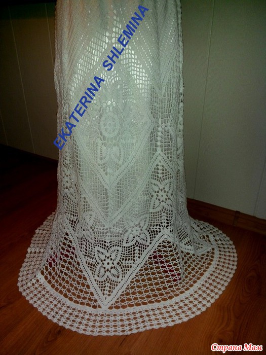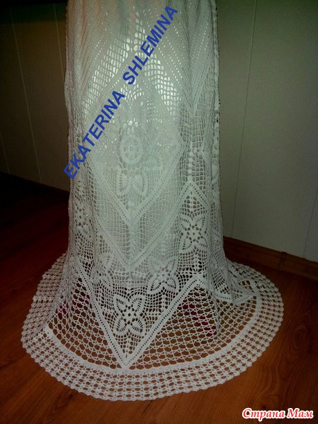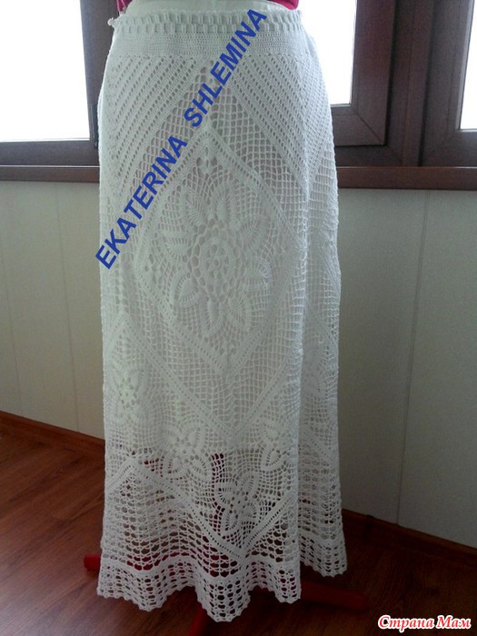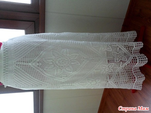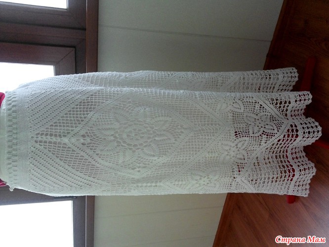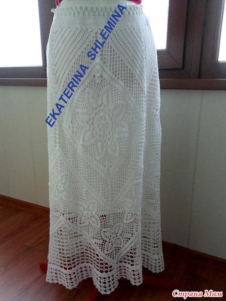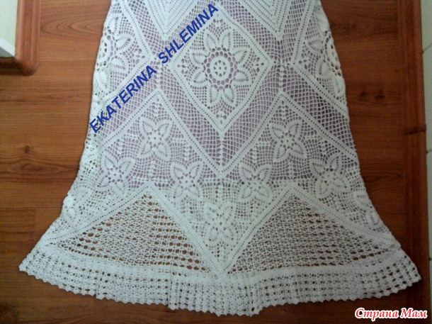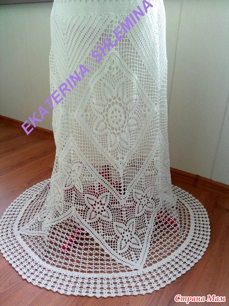 Берете любой красивый мотив квадратный вяжете квадратные мотивы и привязываете их в последнем ряду к предыдущему квадрату. Квадраты соединяете не по прямой ( как прошва), а зигзагом. Затем из маленького квадрата ( того же рисунка) путем фантазии и включения мозгов (извините это мое любимое выражение и оно мне всегда помогает), вяжете круглую салфетку и затем переводите её в квадрат. А дальше все детали обвязываете где сеткой, где плотным узором. Свяжите для начала прямую юбку. её связать легче. А кайму внизу сделайте широкой. Смотрится великолепно!!! Особенно при ходьбе. Подол будет как веер. А в солнечную погоду весь ажурный рисунок (которым связан подол) будет вокруг вас в диаметре 1.5 метра. И уверяю вас все прохожие с удивлением будут смотреть на это чудо на обычном сером асфальте