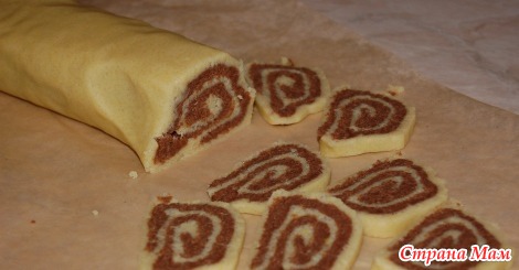 Сложите один пласт на другой и закатайте в колбаску. Положите тесто в холодильник на полчаса, чтобы легче нарезалось