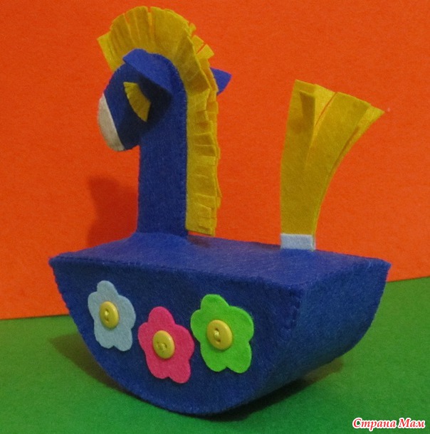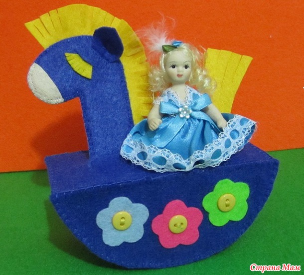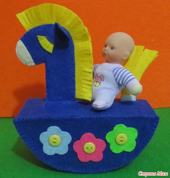 Как я уже сказала, было только одно фото игрушки, так что сама делала выкройку и додумывала как и что делать. Сама лошадка плоская, а качалка-подставка объемная. Чтобы игрушку не сломали, внутрь качалки поместила поролон. Так что все достаточно надежно. Здесь поместила фото уже готовой игрушки. Пошаговое фото у меня в альбоме. Это не МК, так что не делала очень подробно. У нас уже зима и коротюсенький световой день, так что подробную фотосессию проводить сложно.