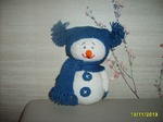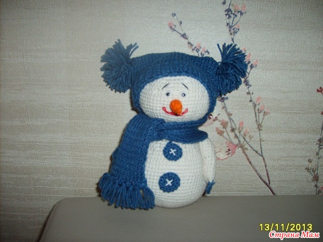 Скоро Новый Год, очень захотелось порадовать своих деток такой игрушкой. Вязала из пряжи Yanart Jeans, описание брала здесь : http://www.livemaster.ru/topic/482927-snegovichki-dlya-novogodnego-nastroeniya