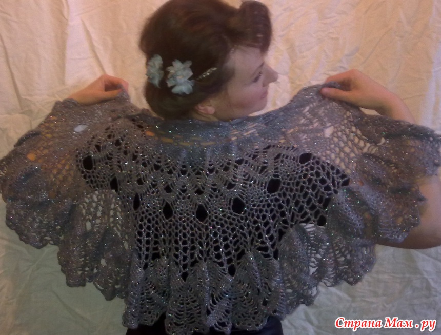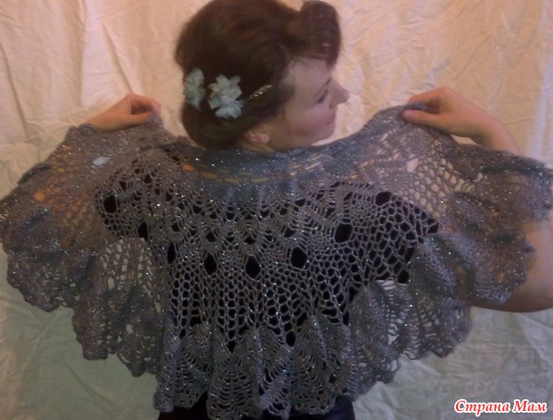 Давно мечтала связать такую накидку, и вот что получилось! Модель взяла из "Журнала мод". Пряжа ALIZE Sal акрил+металлик, 100 г, 460 м. У меня ушло 1,5 моточка. Крючок № 2.