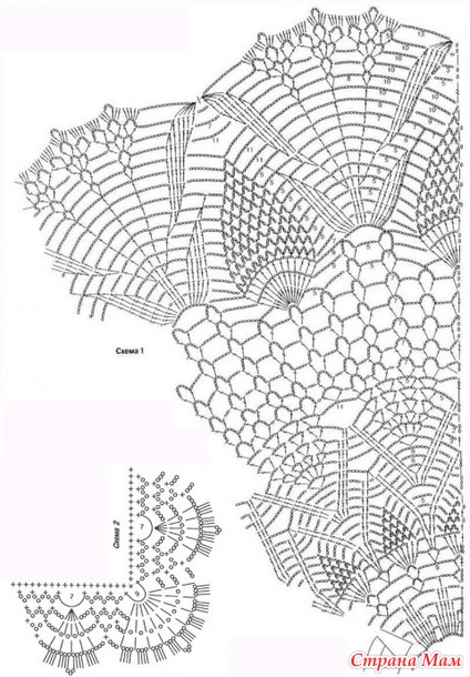 Описание работы: наберите 108 воздушных петель и вяжите по схеме 1-12 раппортов рисунка. Обвяжите вертикальные края столбиками без накида и свяжите кружевной край и воротник по схеме 2.