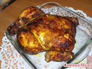 Подготовленную (ощипанную и выпотрошенную) курицу смазываем маринадом, и оставляем на полчаса. (Но если замариновать на сутки - вы об этом не пожалеете). Не забываем периодически смазывать стекшим маринадом, чтобы пропиталась получше.