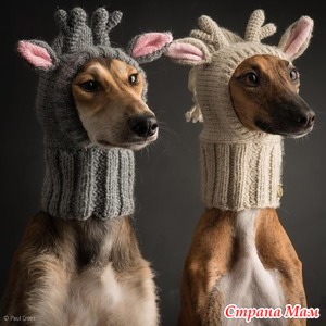 Шапочки прикольные, но бедные собаки, наверное не совсем комфортно себя чуствуют, но позируют спокойно, видать привыкли к таким ухищрениям хозяев, я тоже засомневалась в том можно ли им уши закрывать.
