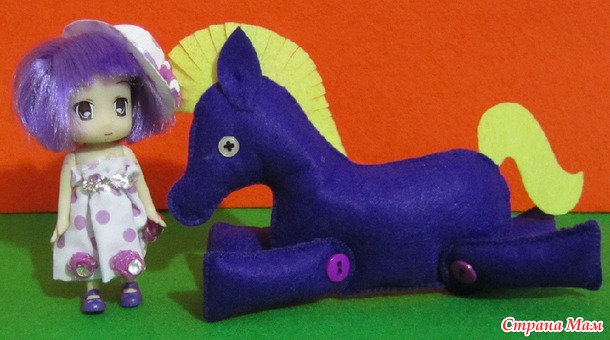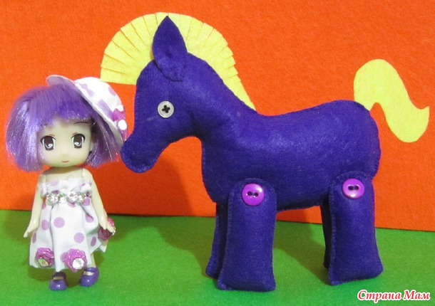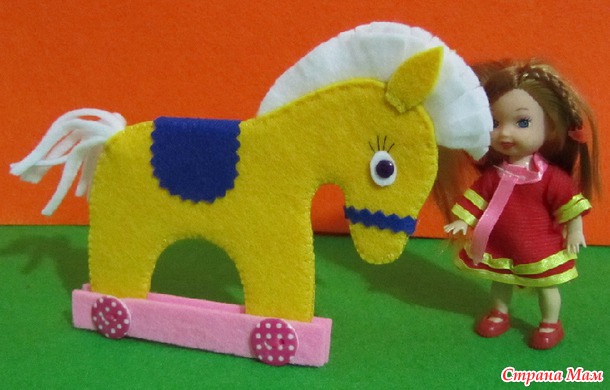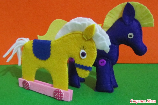 Всем добрый день. А я вот все пробую делать разных лошадок, хочется побольше разнообразия. Сегодня показываю лошадок из фетра (ну очень люблю этот материал). Синяя лошадка с подвижными ногами и желтая лошадка-каталка.