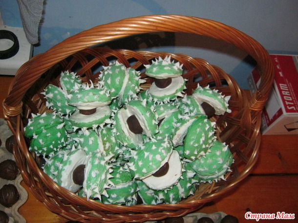 каштаны-это песочное печенье, зернышко внутри из сах пудры, какао и яичный белок, верх каштана окрашен сах пудра+белок+краситель нужного цвета, рецепт грибков можно найти у меня в дневнике, окрашивание грибков аналогично каштанам, ну вот как-то так..