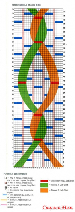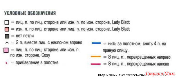 Плотность вязания. Совокупность узоров, спицы № 3,5: 29 п. и 34 р. = 10 х 10 см; лиц. гладь, спицы № 3,5: 22 п. и 36 р. = 10 x10 см.