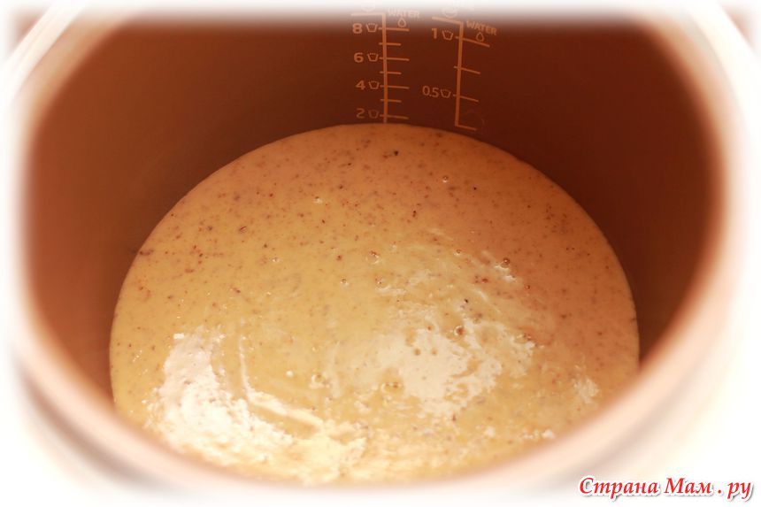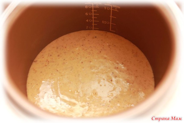 Дно чаши мультиварки смазать маслом и присыпать мукой, чтобы потом пирог легко отстал от кастрюли. Выливаем полученную массу в чашу и ставим на режим "Выпечка". Готовность проверяем зубочисткой или деревянной шпажкой.