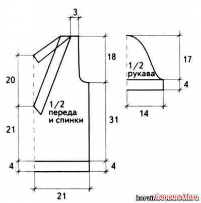 Спинка: наберите 100 п., вяжите 4 см резинкой 1 х1. Далее вяжите лицевой гладью. На высоте 31 см от резинки для пройм закройте с обеих сторон по 7 п. и затем в каждом 2-м ряду еще 3 раза х 1 п. На высоте 38 см разделите полотно на 3 части: 32 п. - 20 п. -32 п.