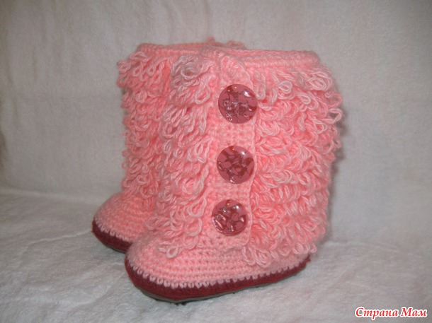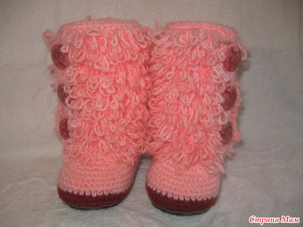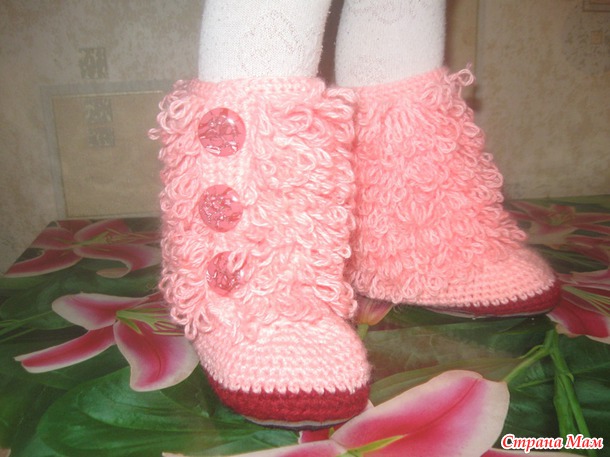 Очень понравились сапожки которые связала Ole4ka_Ya, вот решили, что и нам такие надо. Перевязывала я их много раз, все никак не могла с размером угадать. Вот что получилось