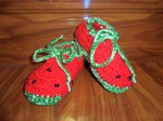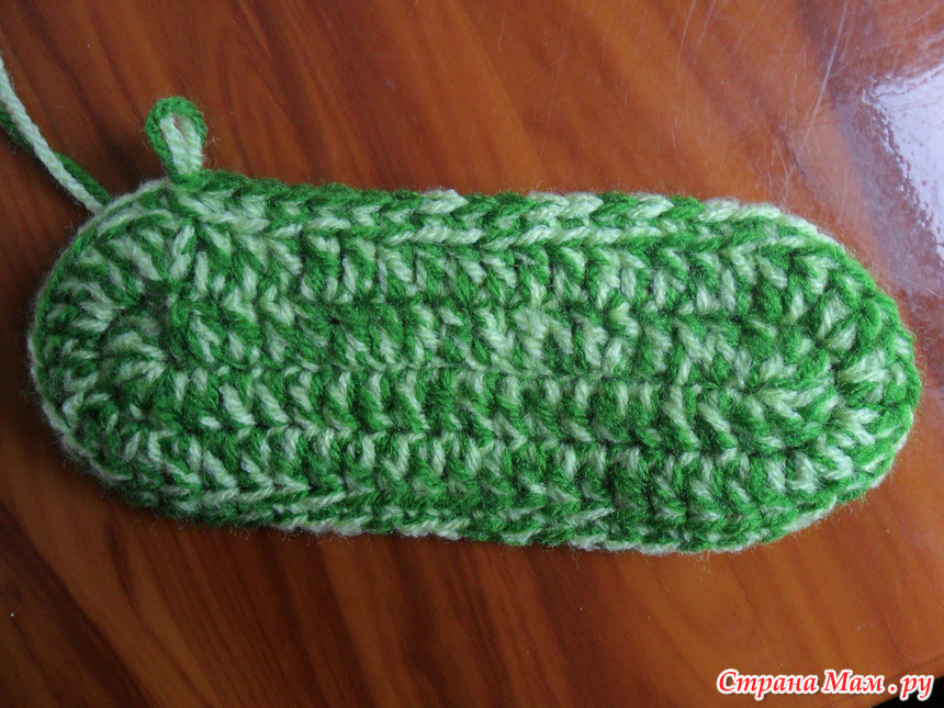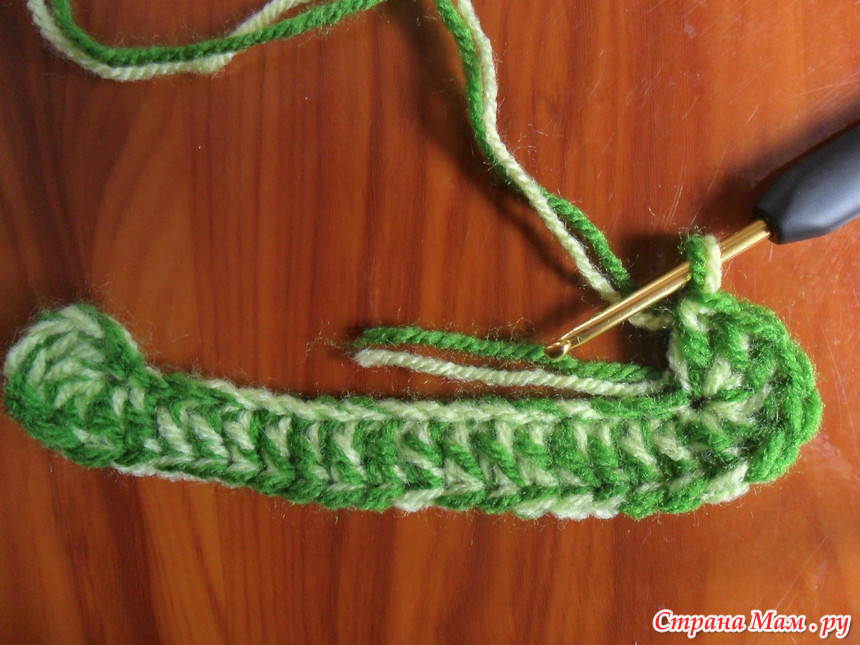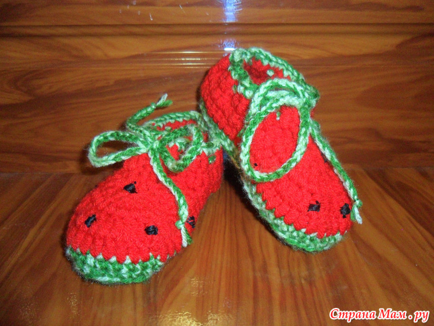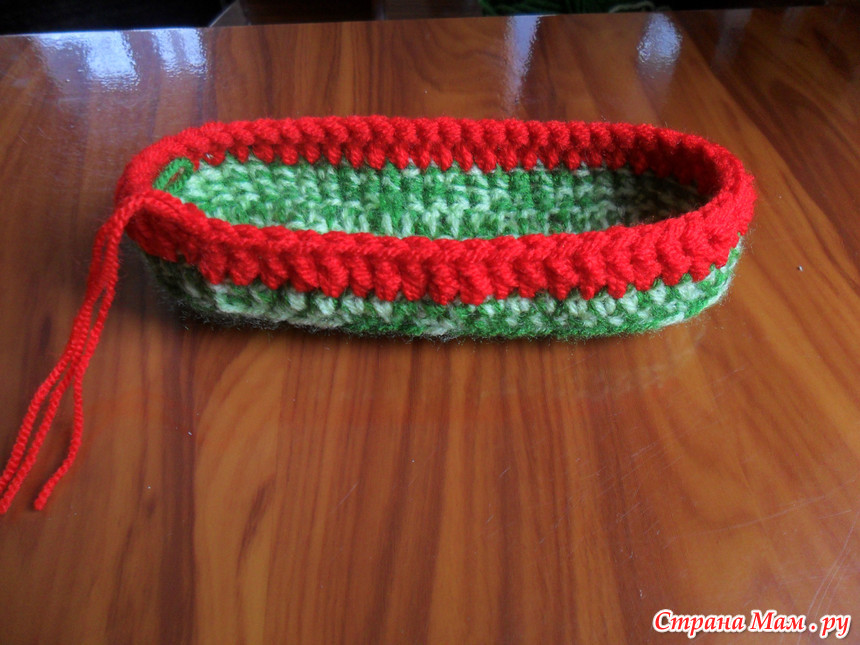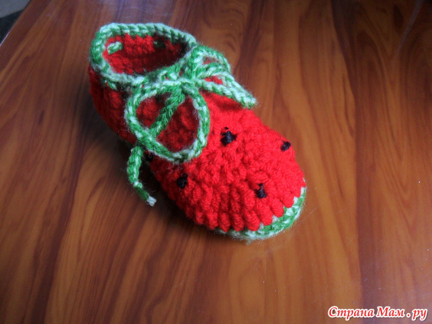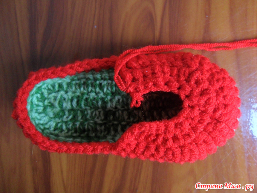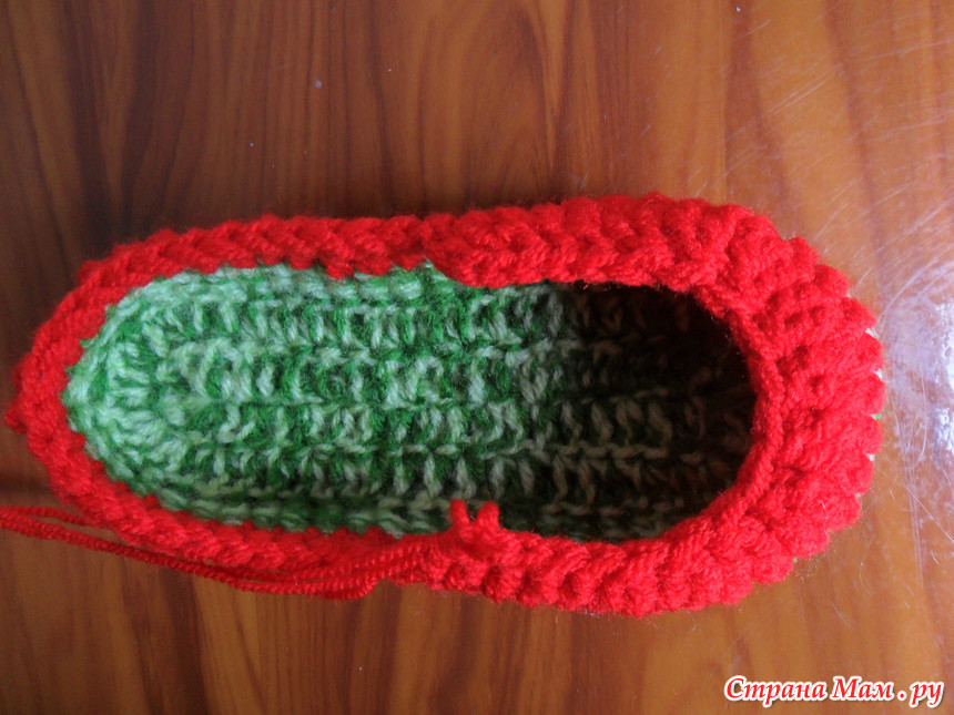 Зелёной нитью вяжем цепочку из воздушных петель необходимой длины, протянуть между столбиками 10 ряда. Мне ещё захотелось чёрной нитью сделать такие вот точечки, как у клубнички. Всё, наши тапочки готовы, малышкины ножки в тепле!
