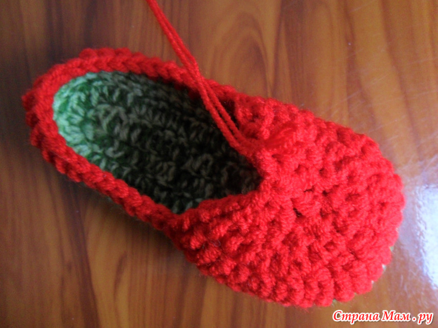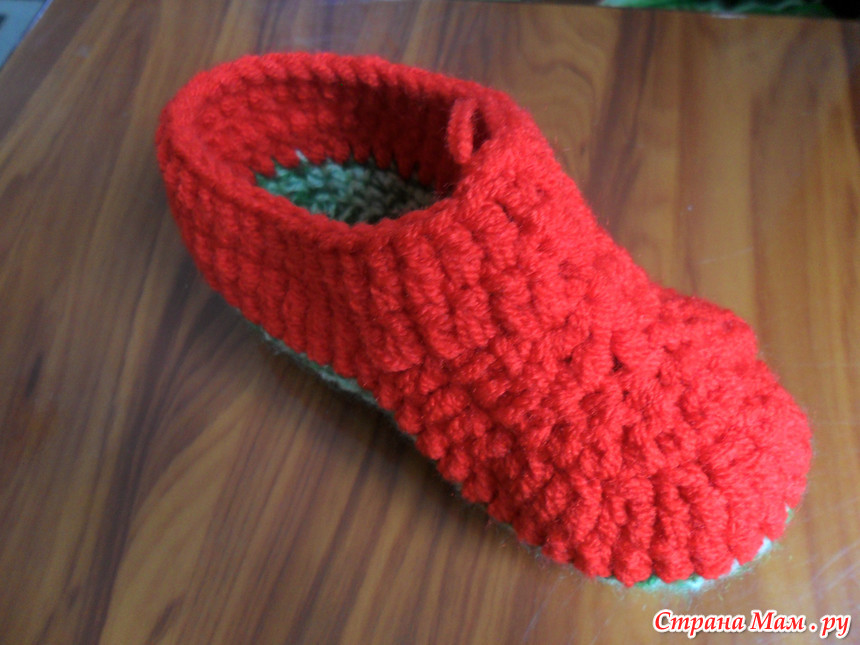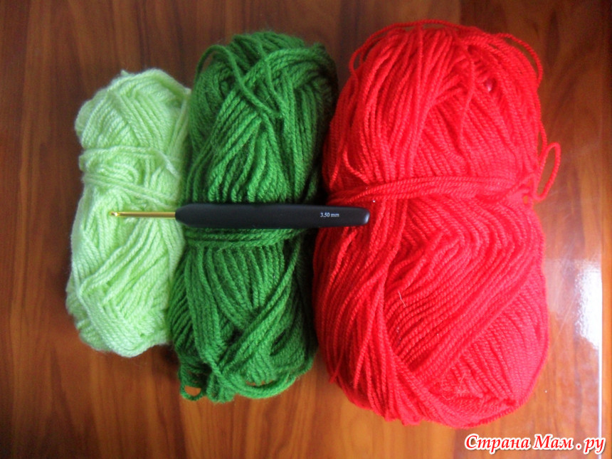 Пряжа у меня, так сказать, какая не жалко, акрил 100% разной толщины. Подошву буду вязать зелёно-салатовую в 2 нитки, а сам тапочек красный в 3нити (красная нить тонкая, где-то 350м в 100г), т. к. хочу получить именно тапочек, а не носок. Крючок использую №3,5.