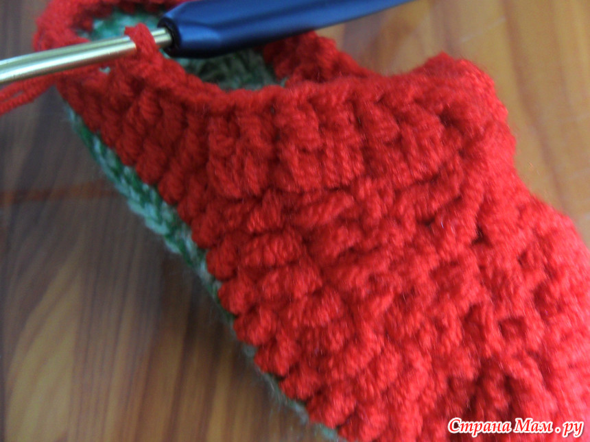 10 ряд: вяжем как 9й и обряваем красную нить.