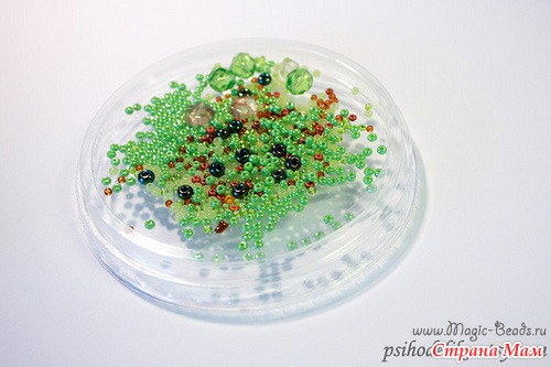 4) Приготовьте желаемую смесь бисера и бусин. Можно использовать совершенно разные бусины и блёстки, а можно выбрать только один вид. Так очень удобно «пристраивать» остатки бисера.