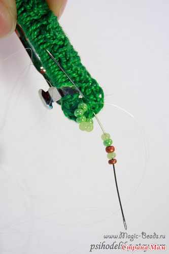 5) Закрепите нить на заколке (можно использовать специальную нить для бисера или брать ту же пряжу, которой обвязана заколка). Наберите на иглу произвольно несколько бисеринок, проденьте иглу через нити на заколке, повторяйте до тех пор, пока вся заколка не будет покрыта бисером. Нанизывать можно мало бусинок, тогда они будут плотно сидеть на заколке, если нанизывать много, то заколка будет «пушистой». Бисер можно подбирать хаотично или по какой-либо закономерности. Можно оставлять просветы, где видна нить, а можно полностью её скрывать. Результат может быть очень и очень разным.
