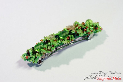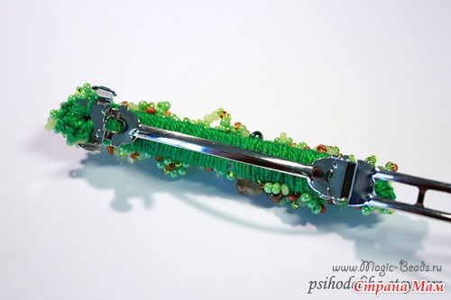 6) Когда вся заколка обшита бисером, закрепите нить. Вставьте внутреннюю часть заколки.