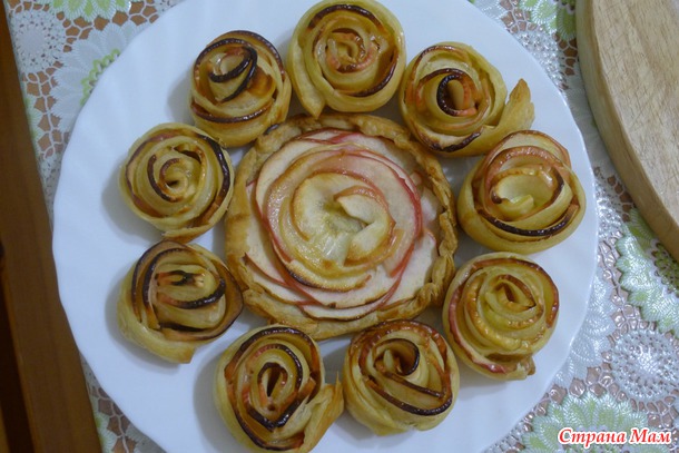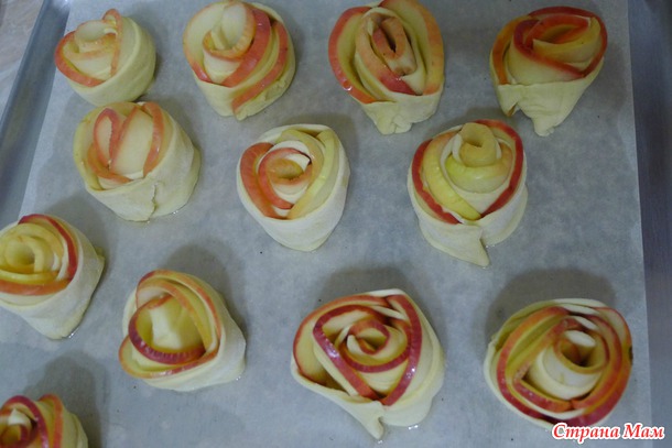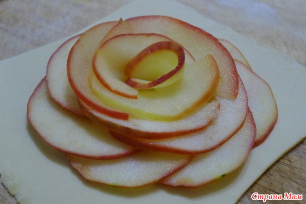 Порезала яблоки полупластиночками, поварила 1 минутку в сиропе (2 стакана воды, 4 ст. л. сахара) и уложила в ряд на полоску слоёного теста (длина 25 см, ширина 3 см.) Завернула всё это в трубочку, получились розочки