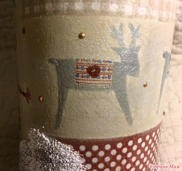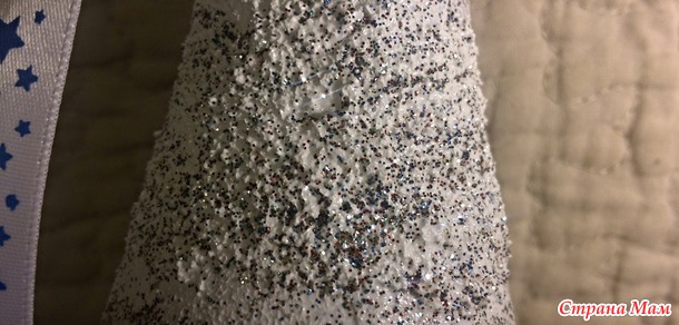 На фото не видно, она вся с отблеском, т. к серху покрыта интерферирующей краской - в один слой она почти прозрачная, но дает интересный перелив. Снег из манки, сверху блестки. Точки и некоторые детали носочков - 3д контуры.